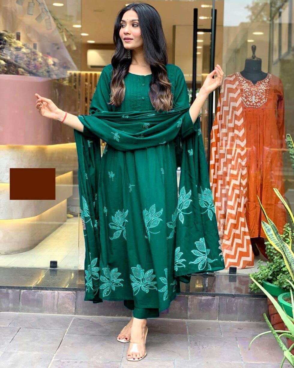 Green Long Kurta having Discharge Floral Print and Printex, Pants & Dupatta Size-XL